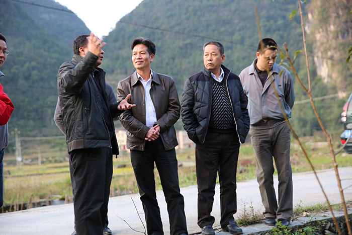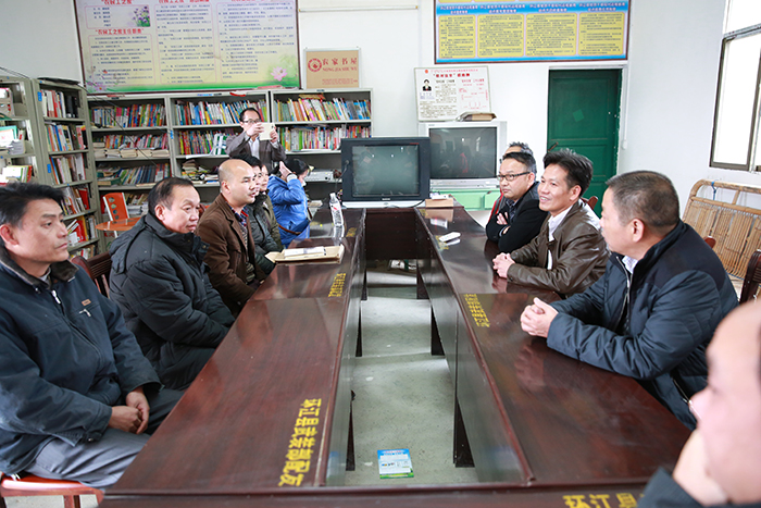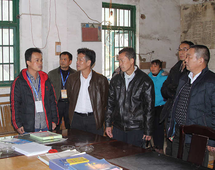 集團公司朱堅和董事長(左三)、張友坐副書記(右一)聽取駐村”第一書記“梁義寬匯報工作。 在相堯村、豹山村、才帛村,朱堅和董事長分別與當?shù)劓?zhèn)、村干部以及覃獻康、梁義寬、蔣博三位派駐農(nóng)村“第一書記”和扶貧工作隊隊員進行親切交談,詳細詢問“第一書記”工作、生活情況,并聽取了“第一書記”關(guān)于幫扶村的黨建及村集體經(jīng)濟發(fā)展情況匯報。得知目前各駐村書記及扶貧工作隊員已經(jīng)完成精準扶貧入戶摸底調(diào)查時,朱堅和董事長對“第一書記”到村以來,深入調(diào)查走訪,積極幫助村里理思路、定規(guī)劃、辦實事,表示充分肯定。