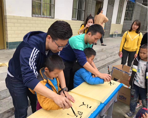 集團(tuán)公司青年團(tuán)干在游園活動(dòng)中教學(xué)生寫毛筆字