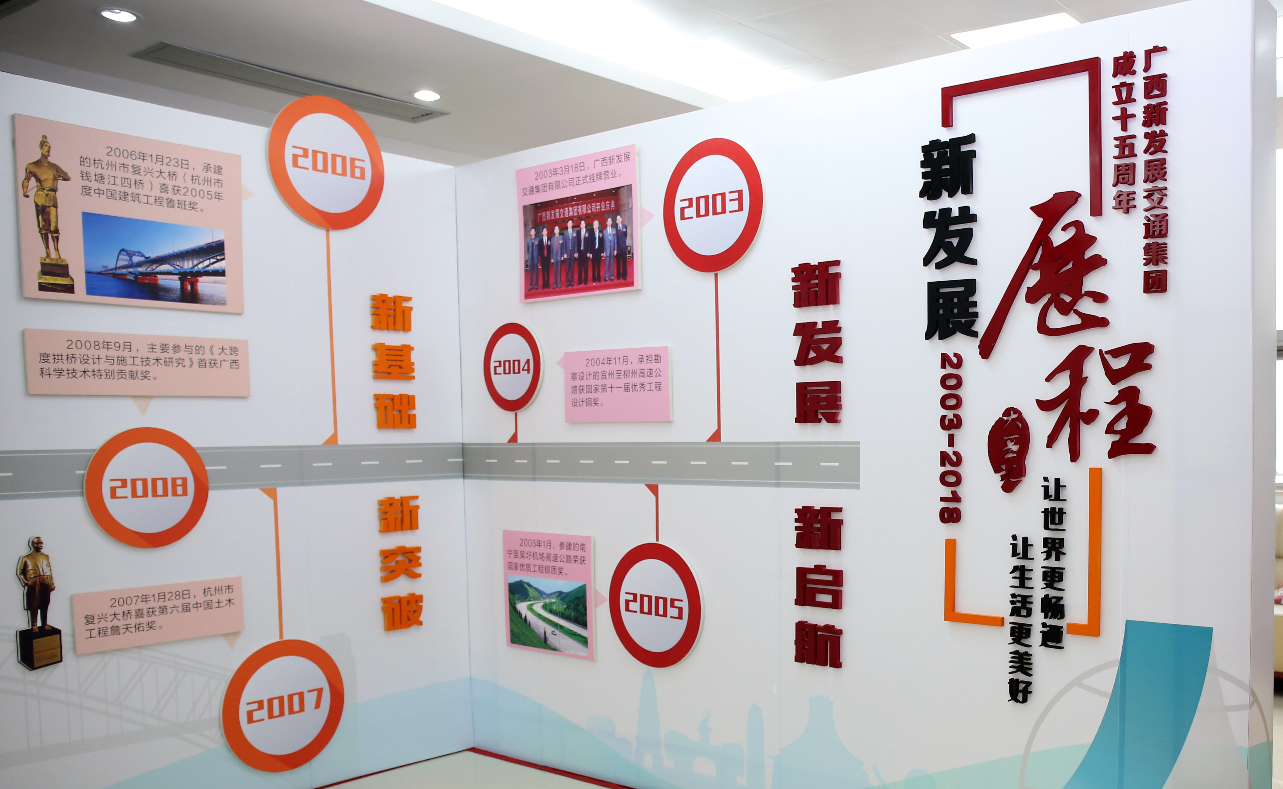 在活動(dòng)現(xiàn)場入口處,設(shè)置有一面企業(yè)發(fā)展歷程墻,展示了歷年來集團(tuán)公司發(fā)展取得的矚目成績。活動(dòng)開始后首先播放了《新時(shí)代 新發(fā)展 新征程》——廣西新發(fā)展交通集團(tuán)15周年紀(jì)錄片,對15年發(fā)展史進(jìn)行了有聲有色的回顧。