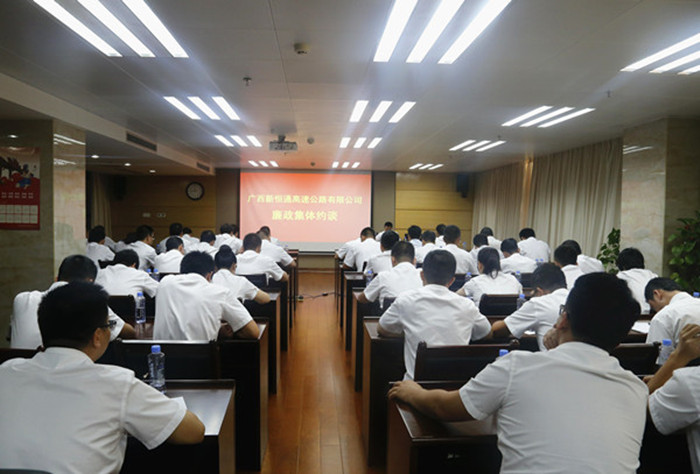 活動上,新恒通公司黨委書記、董事長賴水平還對與會人員進行了廉政集體約談。賴水平感謝吳雄飛老師給大家上了一堂別開生面的廉政警示教育課,作為交通基礎設施建設行業(yè)的業(yè)主單位,在廉潔從業(yè)的道路上,他提出幾點要求和期望:一是加強學習,提升道德修養(yǎng),堅定理想信念;二是嚴于律己,規(guī)范作風行為,筑牢防腐堤壩;三是嚴以用權,增強廉政意識,緊守從業(yè)底線;四是守土有責,堅持“一崗雙責”,深化責任落實。賴水平強調(diào),廣西交通基礎設施建設正處于大有可為、大有作為的歷史機遇期,面對紛繁復雜的形勢,全體黨員干部要在黨的十九大精神的指引下,緊緊圍繞公司總體工作思路和目標,統(tǒng)一思想,堅定信念,持續(xù)加強作風建設,堅決把紀律挺在前面,耳邊常響廉潔警鐘,心中常筑反腐防線,用廉潔從業(yè)的實際行動為公司“縣縣通”高速公路建設事業(yè)的發(fā)展保駕護航。