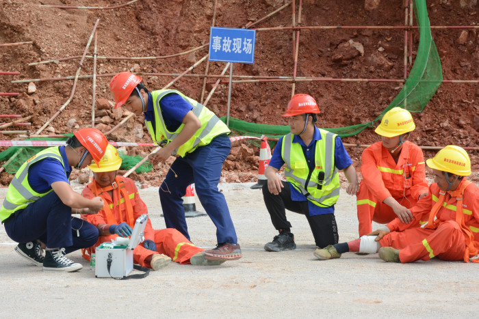 當(dāng)天的演練現(xiàn)場(chǎng)模擬情景為:2019年6月20日,在羅城縣四把鎮(zhèn)沖灣屯附近,融河高速公路K54+100高邊坡處現(xiàn)場(chǎng)4名邊坡防護(hù)作業(yè)人員正在緊張的施工,由于連續(xù)雨天上邊坡坡頂土體部分突然滑落,繼而出現(xiàn)大的滑坡裂縫,隨之大面積土石體坍塌,1名施工人員被垮塌的土石壓埋。事故發(fā)生后,參與演練人員及時(shí)報(bào)告和啟動(dòng)應(yīng)急預(yù)案,在坍塌現(xiàn)場(chǎng)設(shè)置臨時(shí)指揮部,指揮現(xiàn)場(chǎng)救援,將傷者抬出被困位置后,在演練會(huì)場(chǎng)進(jìn)行現(xiàn)場(chǎng)醫(yī)療和急救演示,再由救護(hù)車(chē)送到羅城縣人民醫(yī)院進(jìn)一步治療。